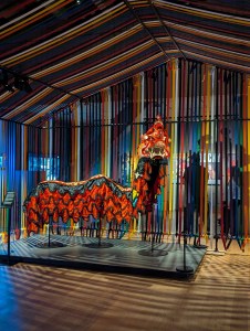 A colourful dragon as part of the martial arts exhibition, with the cinema area behind it