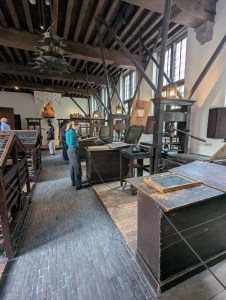 During my stay, I also visited the Museum Plantin-Moretus, which is situated in one of the earliest printing press and publishers in the world. Plantijn and Moretus were a father and son in law duo who set up a very successful enterprise within the family home, including a bookshop. The four-sided building surrounds a formal garden which reflects the family’s love of plants and production of many books on the same subject. The carved wooden blocks depicting botanical specimens were particularly of interest to me, and to see the block alongside a printed page made from it, was fascinating. Elsewhere in the exhibition, were engraved plates of copper metal showing detailed images, such as a historical view of the City. Typefaces were produced by casting individual characters in lead, which were then meticulously placed to create the required text, ready for printing. I had not realised that the font Garamond, still available for use on modern computer systems, dated from the sixteenth century, and would have been known to the Plantin-Moretus business.