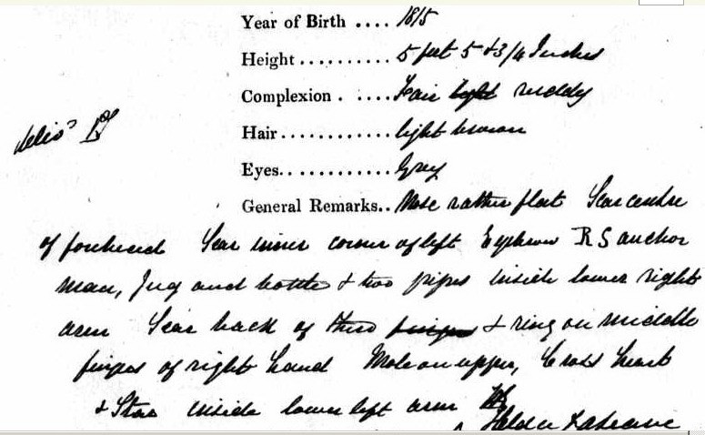 Daniel was tattooed on both arms and the indent provides a detailed description of all of these. I wondered if these were carried out on the journey. An anchor, a bottle and, curiously, three dots, were among his tattoos. Daniel was five feet, five-and three-quarter inches tall with a ruddy complexion, fair hair and grey eyes. Even in the absence of a photograph, I can build a picture of his likeness. His temperament was described as tolerable which, I suppose, is better than intolerable. If he was a petty criminal before transportation, he would have met some more hardened criminals both on his journey and when he arrived.