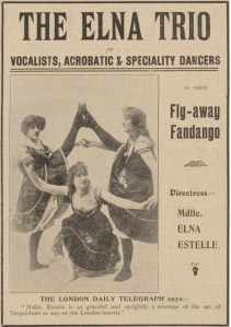 In 1892, Elena was still performing with her husband, T. B. Brydge, in the Brydge Sketch Combination as Nellie Estelle. However, she also had a solo enterprise and was listed for the first time as a ballet mistress, organising and choreographing dances for the pantomime at Morton’s Theatre, Greenwich. This became an annual focus for Elena and in 1894, she began using the performing name of Mlle Elena Estelle. This later became “Madame” rather than mademoiselle as an indication of her seniority and status. She was still Nellie Estelle for the comedy pieces and some dancing but, I suspect, strived to be taken seriously as an academic dancer.