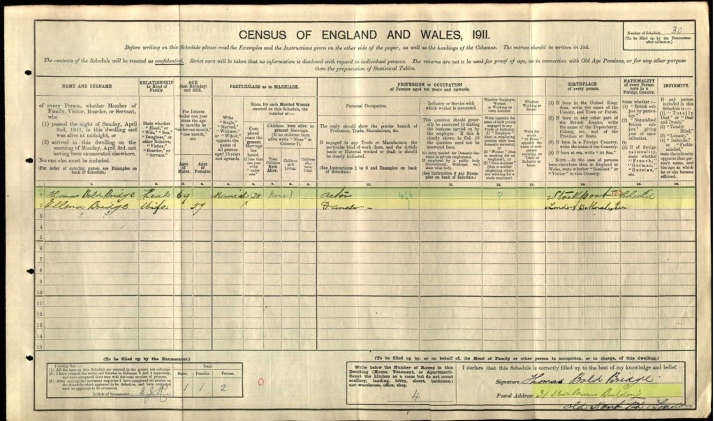 1911 census record with Elena’s profession listed as dancer and Tom’s as actor