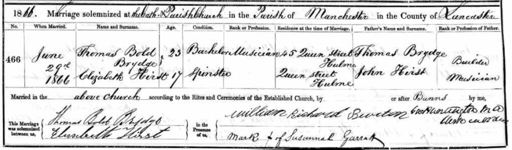 Thomas Bold Brydge marries Elizabeth “Lizzie” Hirst in June 1866 at Manchester Cathedral