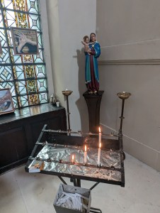 “Are you OK? Do you need any help?”, said the voice behind me. I turned and saw that it was one of the hosts. I explained that I was looking for a donation box for the candle, as I had scrabbled together a few pounds in coins. The host smiled and pointed out the donation point near the font. “I have a lot of family history associated with this church”, I disclosed, and explained that I also did with St Giles in the Fields, just a short distance away. In contemplation, I thanked the host and stepped out into the setting sun.