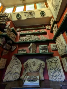 Go through a door and one enters an entirely different space, narrow, shadowy and filled with artifacts. Most dramatic of all, is a central column of light, surrounded by statuary, looking down upon the sarcophagus of the Egyptian Pharoah Seti I. I cannot begin to imagine how residents moved safely through the building by candlelight, but perhaps familiarity aided their passage. Every wall and corner is covered. Most pieces are very old and delicate so this is not a home for residents wedded to their feather duster and polishing cloths.