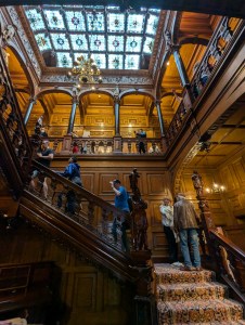 Incredibly ornate woodwork and stained glass windows in the magnificent upper hall