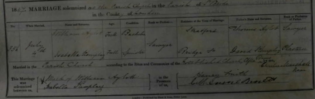 Baby Isabella, my great grandmother, was born in April 1848 and Thomas Aylott, William’s father, died just a year later. He was buried in All Saints Church, West Ham. The lawyer’s pen was passed to William to continue the profession. One fact has puzzled me, and it is this – on the marriage record of William’s sister, Hannah Ann, Thomas signed his name with an X. William did the same on his own marriage record, and yet, both claimed to be lawyers. How could it be that members of the legal profession were unable to sign their own names? This is a mystery to solve for another day.
