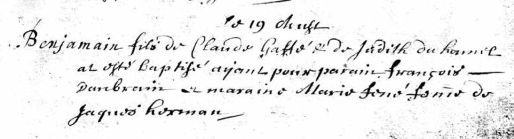 The Gaffes next daughter, Mary, was born just one year later in 1680 but tragically died while still a baby. Then came Susanne, born in 1684 and Elizabeth in 1686. My eight times great grandfather, Benjamin, was born in 1688. Claude and Judith’s youngest son Pierre, was born in 1689.