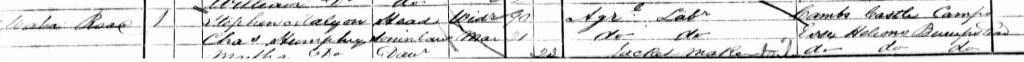 Ten years on in 1861, Stephen was sixty years old, but still had three of his children living at home. Isaac is listed as a horsekeeper, and Martha Ann, aged fifteen as a shirtmaker. Youngest son David, just twelve years old, is also listed as being an agricultural labourer. This census record was nine years before education became compulsory, and even then, only to age eleven, so David was already of employable age.