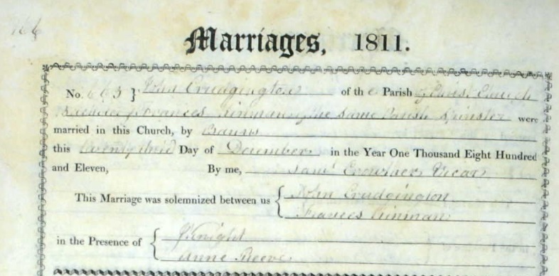 John Crudgington married Frances Kinman at Christ Church, Newgate, in 1811
