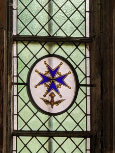 The Huguenot cross in stained glass – seen in the Huguenot chapel in Canterbury Cathedral crypt