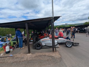 After the run-offs, the racing was halted for lunch. There are a number of catering options on site but some spectators were well prepared with picnics and flasks of tea. At the bottom of the hill, there is a restaurant, bar, and coffee stall. The pits are also at the bottom of the hill. Spectators are able to wander around, look at the cars and see final preparations being undertaken to ready the car for the afternoon’s climbs. The nearest row of cars in the car park seems to also be a prestigious spot, with many classic and performance cars parked, but also on display for people to view and to chat to their owners.