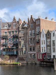 On Sunday morning I set off to enjoy Rotterdam’s interesting architecture. Buildings are wobbly, tilted, and holey. It is a very interesting city to walk in. My hotel was close to the town hall, but rounding the corner onto the main road, the wind tunnel effect was in full force. It was a day of blustery showers and although I was determined to see everything, when I reached the Erasmus Bridge over the Nieuwe Maas river, the wind was relentless, making it challenging to remain standing, let alone taking photographs. Accompanying the wind, was heavy rain, of the kind that resembles a bucket of water being thrown in your face repeatedly. I was determined to see the Kijk-kubus houses, which are close to the Markt Hal and other interesting buildings. After snapping a few pictures I headed towards Delfshaven of the most historic areas, that survived untouched after World War II.