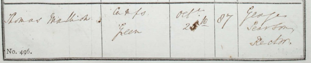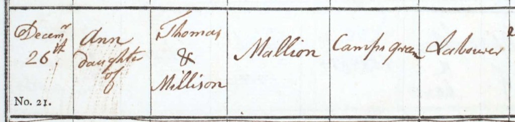 Thomas was born in 1764 but I have a mystery around where. The 1841 census gives his birthplace as “Scotland, Ireland, or foreign parts”, although Wikipedia assures me that the surname Mallyon is English with strong origins in the East of England. In 1891, 38% of Mallyons in the UK were located in Cambridgeshire. So, Thomas’ birthplace will remain a mystery for now.