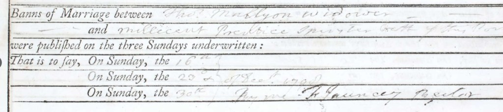 Thomas Mallyon and Millicent Prentice’s marriage banns in December 1798