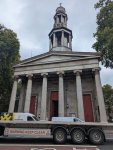 I began my visit by passing through the huge red doors and Greek columns, through the entrance and into the main church. I was warmly greeted and a member of the church team guided us around the building, pointing out key features. St Pancras was a young Roman who was martyred for his faith and a sculpture of him, in military dress adorns one wall. The huge columns behind the main altar, were originally planned to be marble, however, the prohibitive cost, led to them being manufactured from a composite material. This included crushed stone, which was then polished, to give a marble-like appearance at a fraction of the cost.