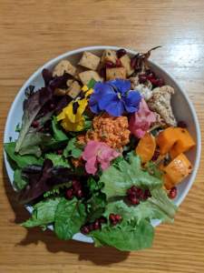 A beautifully presented Buddha bowl with pansies and snapdragons