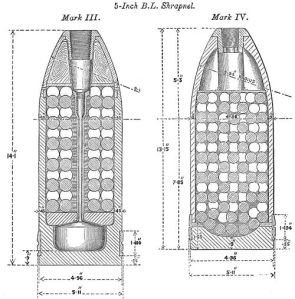 Cross section of two Shrapnel shell designs – By War Office, UK – “Treatise on Ammunition” 4th Edition 1887, Page 217., Public Domain, https://commons.wikimedia.org/w/index.php?curid=7370735