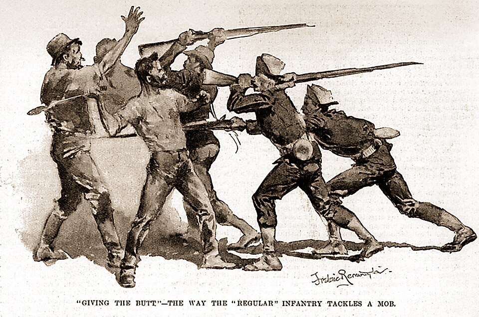 Violence erupted between the strikers and the military charged with keeping the railway functioning – By Frederic Remington – Art done for Harpers’ Weekly, vol. 38, whole no. 1961 (July 21, 1894), pg. 680.; Additional digital editing by Tim Davenport (“Carrite”) for Wikipedia, no copyright claimed for the work, file released to the public domain without restriction., Public Domain, https://en.wikipedia.org/w/index.php?curid=52867290