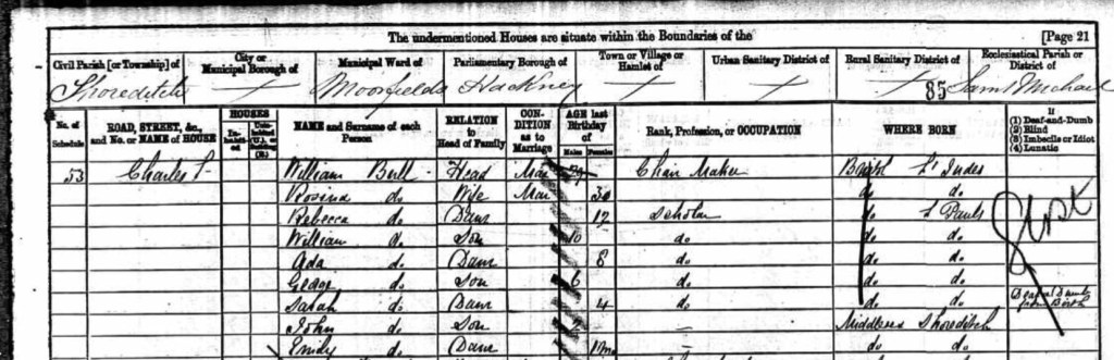 When William Henry junior was baptised, the family were living in the delightfully named, Hampton Court, in the Redland district of Bristol. By 1881, the family had left Bristol for good and moved to Charles Street, Shoreditch, East London. This road no longer exists but is now subsumed into Luke Street. I can imagine that the tall warehouses and workshops contained a variety of small businesses, such as William Henry Bull senior’s chairmaking enterprise. In this particular census, the younger William Henry was ten years old, and the eldest boy of a brood of seven children.