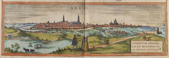 Arras in 1572 – By Georg Braun; Frans Hogenberg: Civitates Orbis Terrarum, Band 1, 1572 (Ausgabe Beschreibung vnd Contrafactur der vornembster Stät der Welt, Köln 1582; [VD16-B7188)Universitätsbibliothek Heidelberghttp://diglit.ub.uni-heidelberg.de/diglit/braun1582bd1, Public Domain, https://commons.wikimedia.org/w/index.php?curid=9832806