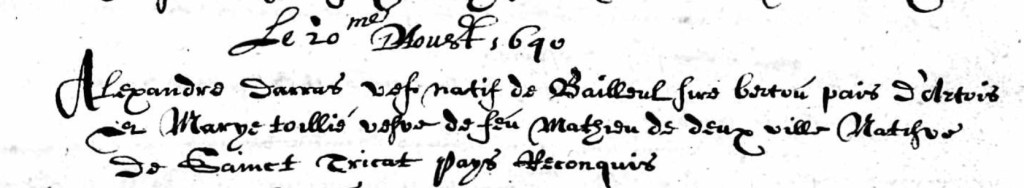 The marriage between Josue Darras and Jeanne Galmar in 1677