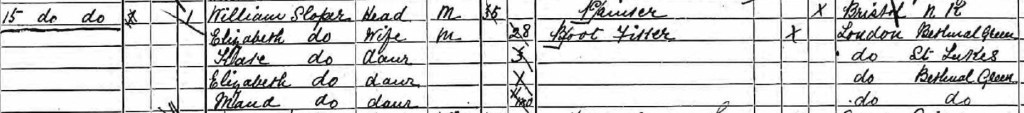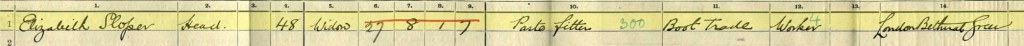Elizabeth claimed to have had eight children, but I have only managed to find records of six but only one child survived. Confusingly, another boy – William Nelson Sloper, born in 1893 and named after his grandfather, survived his siblings, including another William who appeared to be born after. Why name two children with the same first name? I assumed that I had made an error but, upon double checking, I realised that I had not. William Nelson was baptised in 1901, three years after his father died. Many of the Poor Law records are still unindexed so after many hours of searching, I have not found the location of William Nelson and his mother Elizabeth in 1901 or the immediate years before and after. However, she resurfaces in 1911, aged forty eight, and living in Frampton Park Road on her own. Elizabeth was still working as a paste fitter.