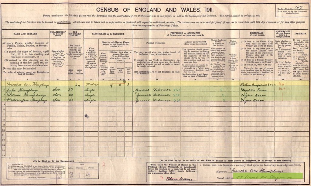 In 1901, Martha was working as a charwoman. Presumably there was no work as a jacket and shirt maker, or perhaps her specialism was in country wear, rather than work clothes for urban life. John, Thomas and Walter were also working as general labourers. In 1911, Martha and the boys had moved further back from the River Lea to Prout Rod. The 1911 census is an interesting one because it was the first to be completed by the householder and includes additional information, such as how many rooms the family occupy, how many years of marriage they had completed, and whether any of their children had died. The Humphrey or Humphreys family lost three of their nine children. This is a sobering statistic, a third of the family’s children did not survive.
