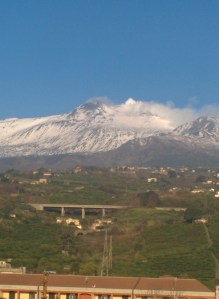 After a short while, the train was rumbling off of the ferry and I was hoping that I was indeed in the correct half and heading for Catania, my intended destination. In fact, my fears were soon allayed as the train pulled into beautiful Taormina station just as the sun was rising and breakfast was being served. A strong coffee, pastry, newspaper and boiled sweets were provided. Corridor chatting resumed so I felt brave enough to throw open my cabin door and bid a few people buongiorno. A snow-capped Mount Etna formed a magnificent backdrop for the rest of the journey, puffing steam on one side, and smoke from the other. I last visited Sicily in 1980 but I remembered this view. To live so close to such an active volcano invokes a certain level of peril and bravado, rather like driving a Ferrari.