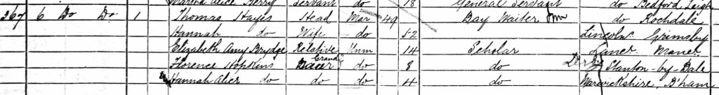 1881 England census showing Elizabeth Amy Bridge living at 6 Dawson Street, Manchester, with Thomas and Hannah Hayes
