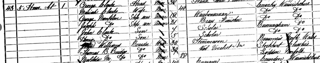 1881 England census showing Thomas B Bridge and Matilda M Bridge lodging in 5 Howe Street, Duddeston, Birmingham